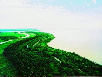自明萬歷八年(公元1580年)起,洪澤湖大堤的迎水坡開始增筑直立式條石墻護面,時稱“石工墻”,歷經(jīng)明清兩代171年形成規(guī)模!笆Α庇们Ы镏氐臈l石及糯米石灰漿砌筑,共用條石6萬多塊,規(guī)格統(tǒng)一,筑工精細,充分展示了我國古代水利建設(shè)的高超技藝。現(xiàn)如今,洪澤湖大堤已被納入江蘇省申報世界文化遺產(chǎn)的推薦名單之中。大堤兩側(cè)遍植樹木,宛如游移欲飛的巨龍依水而臥。人行其中,倍覺“浩渺云煙籠細浪,空蒙雨色入重淵”。