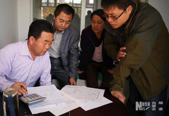 包頭市北梁棚戶區(qū)改造工程第八片區(qū)小組組長(zhǎng)王富才(左一)幫居民核算現(xiàn)有住房面積,制訂選房方案。新華社記者賈立君攝
