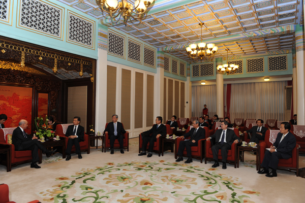 新華社社長(zhǎng)李從軍(左三),經(jīng)濟(jì)參考報(bào)總編輯杜躍進(jìn)(右一)參與會(huì)見