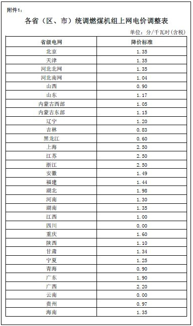 一、降低有關(guān)。▍^(qū)、市)燃煤發(fā)電企業(yè)脫硫標(biāo)桿上網(wǎng)電價,具體降價標(biāo)準(zhǔn)見附件1。各地未執(zhí)行標(biāo)桿電價的統(tǒng)調(diào)燃煤發(fā)電企業(yè)上網(wǎng)電價同步下調(diào)。