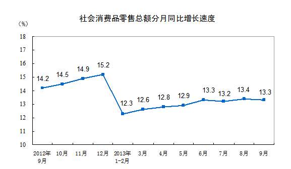 國家統(tǒng)計(jì)局18日發(fā)布數(shù)據(jù),2013年9月份,社會(huì)消費(fèi)品零售總額20653億元,同比名義增長13.3%(扣除價(jià)格因素實(shí)際增長11.2%,以下除特殊說明外均為名義增長)。其中,限額以上企業(yè)(單位)消費(fèi)品零售額10526億元,增長12.4%。1-9月份,社會(huì)消費(fèi)品零售總額168817億元,同比增長12.9%。