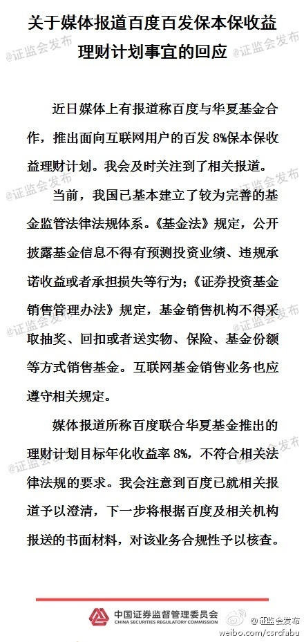 媒體報(bào)道所稱百度聯(lián)合華夏基金推出的理財(cái)計(jì)劃目標(biāo)年化收益率8%,不符合相關(guān)法律法規(guī)的要求。我會(huì)注意到百度已就相關(guān)報(bào)道予以澄清,下一步將根據(jù)百度及相關(guān)機(jī)構(gòu)報(bào)送的書面材料,對(duì)該業(yè)務(wù)合規(guī)性予以核查。