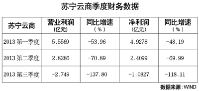 10月30日,蘇寧云商公布了2013年三季報,數(shù)據(jù)顯示,今年前三季度,蘇寧云商實現(xiàn)營業(yè)總收入801.43億元,同比增長10.65%;實現(xiàn)歸屬于母公司股東的凈利潤僅6.25億元,同比大幅下滑了73.41%。