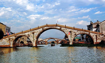 在雙林古鎮(zhèn)區(qū)中,以“三橋”為代表的橋文化景觀具有較高的歷史價值和文化品位。據(jù)《東西林匯考》記載,雙林古鎮(zhèn)歷史上曾有橋125座,其中始建于宋代4座,元代1座,明代13座,清代35座。雖經(jīng)滄桑變遷,大部分已廢圯湮沒,但至今仍不失為“江南古橋留存集中區(qū)”(《中華文物古跡旅游·古代橋梁》之語),僅鎮(zhèn)區(qū)尚有21座之多。其中鎮(zhèn)北的萬元、化成、萬魁三橋始建于明代以前,均為市級文保單位。橋長50米左右,且空間水平相距不到360米,為江南僅有。