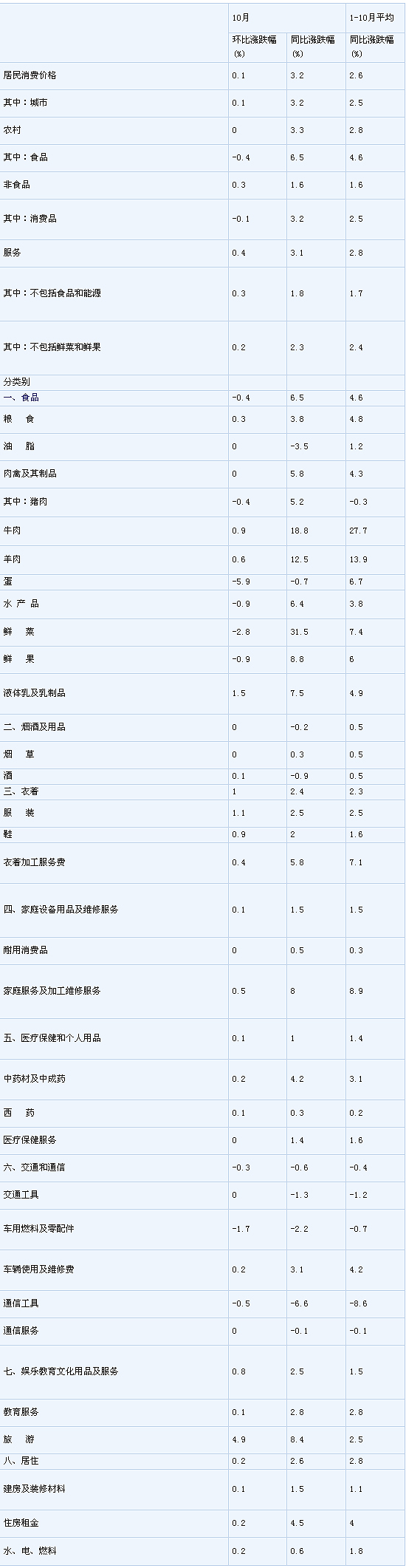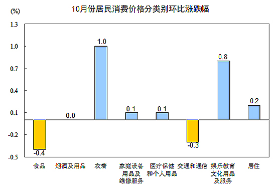 10月份,全國(guó)居民消費(fèi)價(jià)格總水平環(huán)比上漲0.1%。其中,城市上漲0.1%,農(nóng)村持平(漲跌幅度為0);食品價(jià)格下降0.4%,非食品價(jià)格上漲0.3%;消費(fèi)品價(jià)格下降0.1%,服務(wù)價(jià)格上漲0.4%。