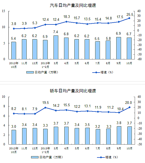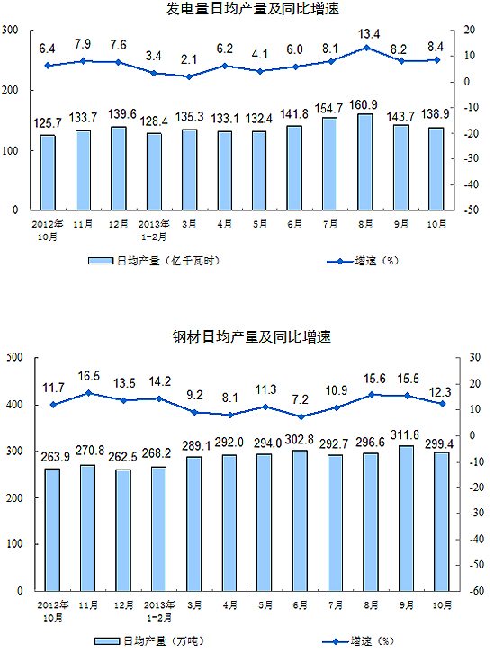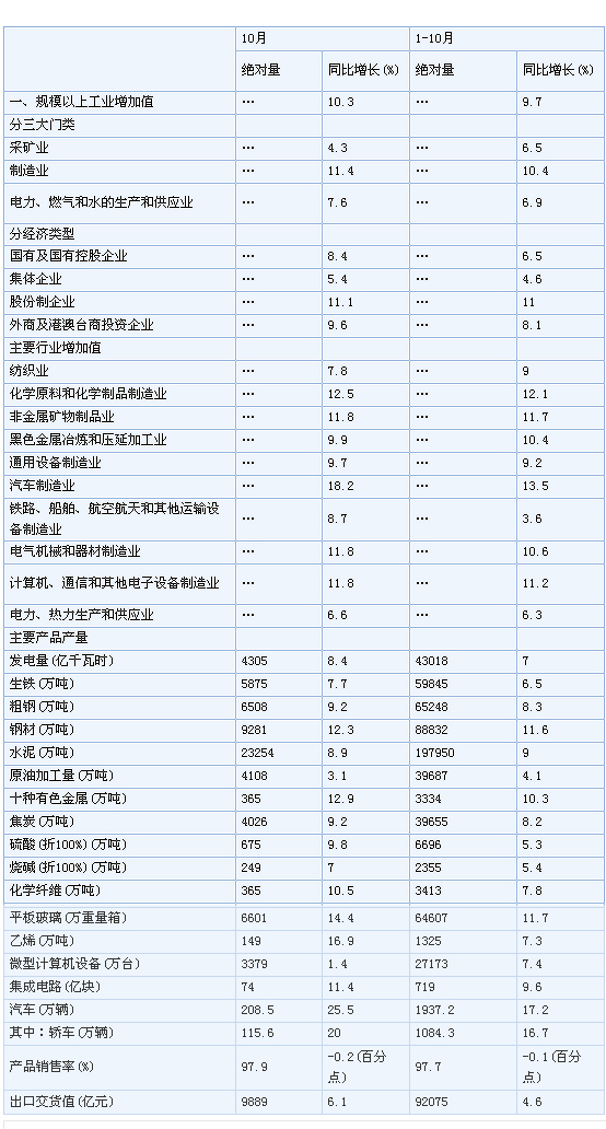 分產品看,10月份,464種產品中有328種產品同比增長。其中,發(fā)電量4305億千瓦時,同比增長8.4%;鋼材9281萬噸,增長12.3%;水泥23254萬噸,增長8.9%;原油加工量4108萬噸,增長3.1%;十種有色金屬365萬噸,增長12.9%;乙烯149萬噸,增長16.9%;汽車208.5萬輛,增長25.5%;轎車115.6萬輛,增長20.0%。