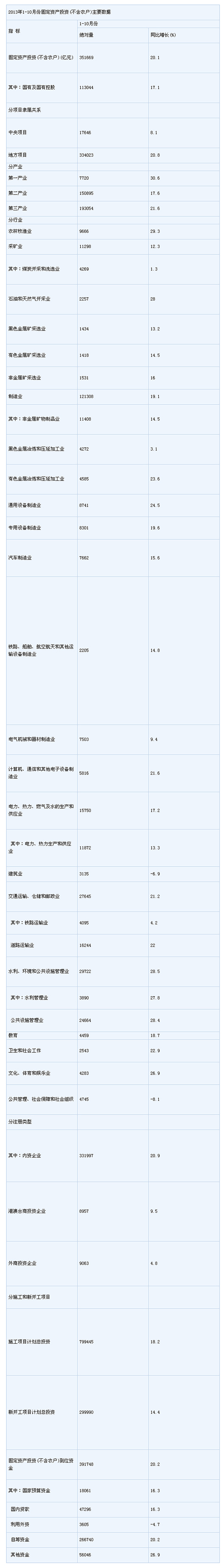 從項目隸屬關(guān)系看,1-10月份,中央項目投資17646億元,同比增長8.1%,增速比1-9月份回落2.3個百分點;地方項目投資334023億元,增長20.8%,增速加快0.1個百分點。