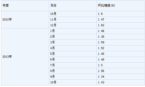 根據(jù)季節(jié)調(diào)整模型自動修正程序,對2012年10月份以來的固定資產(chǎn)投資(不含農(nóng)戶)環(huán)比增速進行修訂。修訂結(jié)果及2013年10月份環(huán)比數(shù)據(jù)如下: