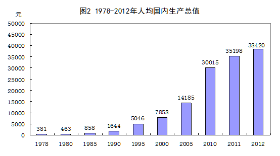 人均國內(nèi)生產(chǎn)總值不斷提高,成功實現(xiàn)從低收入國家向上中等收入國家的跨越。1978年人均國內(nèi)生產(chǎn)總值僅有381元,1987年達(dá)到1112元,1992年達(dá)到2311元,2003年超過萬元大關(guān)至10542元,2007年突破2萬元至20169元,2010年再次突破3萬元大關(guān)至30015元,2012年人均國內(nèi)生產(chǎn)總值達(dá)到38420元,扣除價格因素,比1978年增長16.2倍,年均增長8.7%。人均國民總收入也實現(xiàn)同步快速增長,根據(jù)世界銀行數(shù)據(jù),我國人均國民總收入由1978年的190美元上升至2012年的5680美元,按照世界銀行的劃分標(biāo)準(zhǔn),已經(jīng)由低收入國家躍升至上中等收入國家,對于我國這樣一個經(jīng)濟發(fā)展起點低、人口基數(shù)龐大的國家,能夠取得這樣的進(jìn)步確實難能可貴。