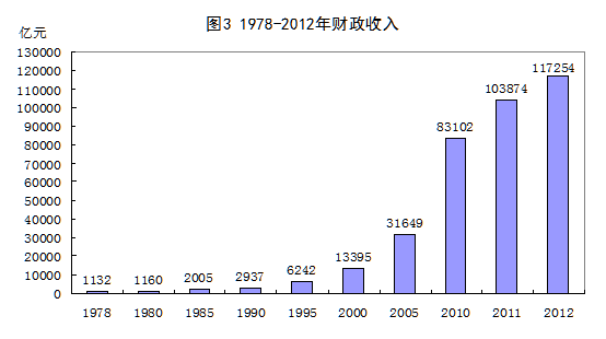國家財政實力明顯增強,政府對經(jīng)濟和社會發(fā)展的調(diào)控能力日益增強。1978年國家財政收入僅1132億元,1985年翻了近一番,達(dá)到2005億元,1993年再翻一番,達(dá)到4349億元,1999年跨上1萬億臺階,達(dá)到11444億元,2007年超過5萬億元,達(dá)到51322億元,2011年再次超過10萬億元,2012年,我國財政收入達(dá)到117254億元,比1978年增長103倍,年均增長14.6%。財力的增加對我國促進(jìn)經(jīng)濟發(fā)展、加強社會保障、減小城鄉(xiāng)差距、切實改善民生、有效應(yīng)對各類沖擊提供了有力的資金保障。