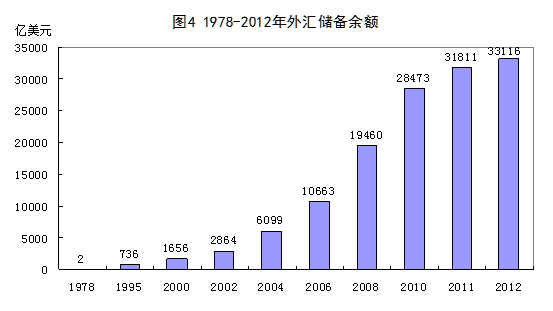 外匯儲備大幅增長,實現(xiàn)從外匯短缺國到世界第一外匯儲備大國的巨大轉(zhuǎn)變。1978年,我國外匯儲備僅1.67億美元,位居世界第38位,人均只有0.17美元,折合成人民幣不足1塊錢。隨著我國對外經(jīng)濟的發(fā)展壯大,經(jīng)常項目貿(mào)易盈余不斷積累,外匯儲備的短缺迅速成為歷史,1990年外匯儲備超過百億美元,達(dá)到111億美元,1996年超過千億美元,達(dá)到1050億美元,2006年超過1萬億美元,達(dá)到10663億美元,超過日本位居世界第一位,2011年超過3萬億美元,2012年達(dá)到33116億美元,連續(xù)七年穩(wěn)居世界第一位。