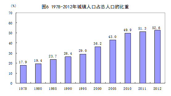 城鎮(zhèn)化步伐明顯加快。城鎮(zhèn)化水平由1978年的17.9%上升到2012年的52.6%,上升了34.7個百分點,年均上升1.0個百分點。城鎮(zhèn)總?cè)丝谀昃黾?586萬人,鄉(xiāng)村總?cè)丝谀昃鶞p少435萬人。城鎮(zhèn)化水平的提升促進(jìn)了城鄉(xiāng)經(jīng)濟的協(xié)調(diào)發(fā)展,有利于居民消費結(jié)構(gòu)升級,并不斷催生新的經(jīng)濟增長點,是擴大內(nèi)需的最大潛力所在。隨著城鎮(zhèn)化和工業(yè)化進(jìn)程的加快,城鎮(zhèn)吸納就業(yè)的能力也不斷增強。城鎮(zhèn)就業(yè)人員占全國的比重從1978年的23.7%上升到2012年的48.4%,鄉(xiāng)村就業(yè)人員占比從76.3%下降51.6%。