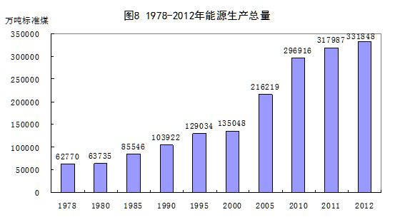 能源生產(chǎn)能力不斷提高。隨著工業(yè)化的推進(jìn),我國逐漸成為能源消費大國,與此同時,能源生產(chǎn)能力也不斷提升,能源自給率保持較高水平,一定程度上保證了國家經(jīng)濟安全。2012年,我國能源生產(chǎn)總量達(dá)到33.2億噸標(biāo)準(zhǔn)煤,比1978年增長4.3倍,年均增長5.0%。同期,我國能源消費總量年均增長5.6%,與能源生產(chǎn)增速的差距不大,能源總自給率達(dá)到90%以上。能源生產(chǎn)結(jié)構(gòu)不斷優(yōu)化,水電、核電、風(fēng)電等清潔能源和可再生能源生產(chǎn)量在能源生產(chǎn)總量中的比重由1978年的3.1%提高到2012年的10.3%。