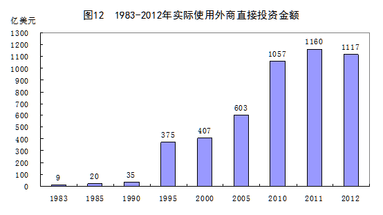 引進(jìn)外資與對外投資活動日益頻繁。改革開放以來,我國充分發(fā)揮了資源、勞動力等要素優(yōu)勢和巨大的潛在市場優(yōu)勢,成為國際直接投資的熱土,利用外資規(guī)模不斷擴大,外商直接投資成為推動我國經(jīng)濟發(fā)展和技術(shù)進(jìn)步的重要力量。1979-2012年,實際使用外商直接投資12761億美元,1984-2012年以年均18.0%的高速度增長。我國已連續(xù)多年成為吸收外商直接投資最多的發(fā)展中國家,世界排名也上升至第二位。近些年來,隨著我國企業(yè)實力的提升,“走出去”的步伐開始加大。中國對外直接投資凈額由2007年的265億美元快速提高到2012年的878億美元,2012年末對外直接投資存量達(dá)到5319億美元。