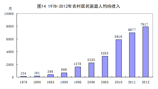 城鄉(xiāng)居民收入顯著提高。35年來,黨中央、國務(wù)院深化收入分配制度改革,努力實現(xiàn)居民收入增長和經(jīng)濟發(fā)展同步、勞動報酬增長和勞動生產(chǎn)率提高同步,效率和公平兼顧,確保了城鄉(xiāng)居民收入和財富的快速增長。2012年,城鎮(zhèn)居民人均可支配收入24565元,比1978年增長71倍,年均增長13.4%,扣除價格因素,年均增長7.4%;農(nóng)村居民人均純收入7917元,增長58倍,年均增長12.8%,扣除價格因素,年均增長7.5%。城鄉(xiāng)居民擁有的財富顯著增加。2012年末,城鄉(xiāng)居民人民幣儲蓄存款余額39.96萬億元,比1978年末增長1896倍,年均增長24.9%。股票、債券等金融資產(chǎn)規(guī)模不斷擴大。城鎮(zhèn)居民擁有的財產(chǎn)性收入從無到有,2012年占人均全部年收入比重上升到2.6%。