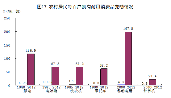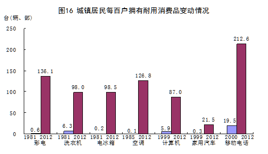 居民生活水平和質(zhì)量極大改善。2012年,城鎮(zhèn)居民人均現(xiàn)金消費支出16674元,比1978年增長52.6倍,年均名義增長12.4%;農(nóng)村居民人均消費支出5908元,增長49.9倍,年均名義增長12.3%。城鄉(xiāng)居民消費結(jié)構(gòu)明顯優(yōu)化。2012年,城鎮(zhèn)居民恩格爾系數(shù)為36.2%,比1978年下降21.3個百分點;農(nóng)村居民恩格爾系數(shù)為39.3%,下降28.4個百分點。居住條件極大改善。2012年,城鎮(zhèn)居民人均住宅建筑面積32.9平方米,比1978年增加26.2平方米;農(nóng)村居民人均住房面積37.1平方米,增加29.0平方米。消費領(lǐng)域不斷拓展,物質(zhì)生活極大豐富。彩電、電冰箱、空調(diào)、電話等耐用消費品逐步普及,汽車、電腦等高檔耐用消費品擁有量大幅提高。2012年末,城鎮(zhèn)居民家庭平均每百戶移動電話、計算機和家用汽車擁有量分別為212.6部、87.0臺和21.5輛,分別比2000年末增加193.1部、77.3臺和21.0輛。