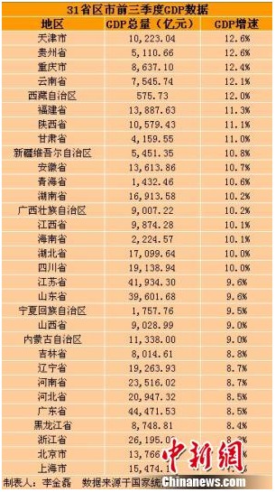 國家統(tǒng)計(jì)局公布的數(shù)據(jù)顯示,天津和貴州的前三季度GDP增速最高,均為12.6%;重慶以12.4%排名第三;而北京和上海前三季度GDP增速同為7.7%,排名墊底。