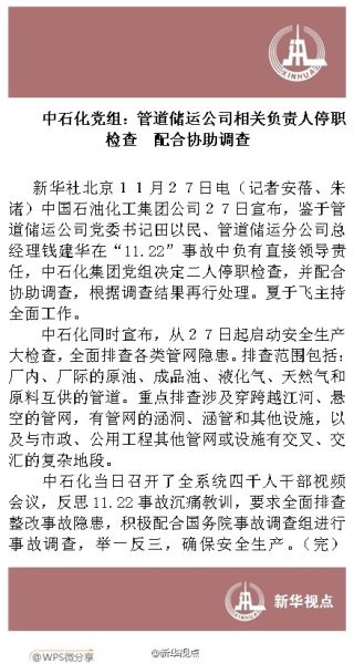 【中石化管道儲運公司相關(guān)負(fù)責(zé)人停職檢查】中國石油化工集團(tuán)公司27日宣布,鑒于管道儲運公司黨委書記田以民、管道儲運分公司總經(jīng)理錢建華在“11.22”事故中負(fù)有直接領(lǐng)導(dǎo)責(zé)任,中石化集團(tuán)黨組決定二人停職檢查,并配合協(xié)助調(diào)查,根據(jù)調(diào)查結(jié)果再行處理。詳見上圖。