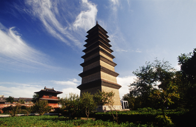 凌霄塔位于正定天寧寺內(nèi),因其以木構(gòu)為主而俗稱(chēng)木塔。始建于唐代宗年間(762-779年),宋、金均有重修。塔平面呈八角形,為九級(jí)磚木混合結(jié)構(gòu)的閣樓式塔,高40.98米,可供人登臨。其精妙之處是于塔心室四層以上保留著對(duì)穩(wěn)定塔身極為有利的塔心柱結(jié)構(gòu),這種形式為全國(guó)孤例。