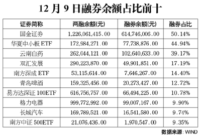 值得注意的是,截至12月9日,國金證券的融券余額占其融資融券余額的比例已經(jīng)達到了50.14%。相比之下,WIND統(tǒng)計數(shù)據(jù)顯示,在12月9日有記錄的713只兩融標(biāo)的券種當(dāng)中,這個比例位列第一,遠遠超出了其他標(biāo)的。不僅如此,在這713只標(biāo)的券種當(dāng)中,有706只的融券占比低于10%。國金證券的這一融券比例,僅有華夏中小板ETF堪與之相比,后者融券占比為44.9%。也就是說,在目前所有兩融標(biāo)的券種當(dāng)中,國金證券是融資和融券的多空比例最為勢均力敵的標(biāo)的券種,也是全市場唯一的一只融券余額超出融資余額的標(biāo)的券種。就兩融的整體市場而言,截至12月9日當(dāng)天,兩融總余額為3346.08億元,融券余額則為39.79億元,融券余額占兩融的比例僅為1.19%。國金證券的融券余額比例已經(jīng)遠遠超出了這一數(shù)量級。