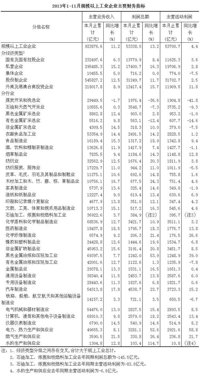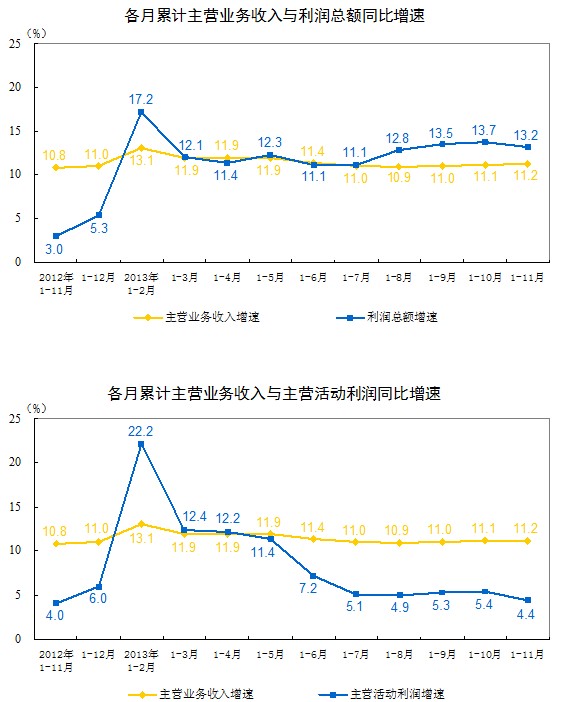1-11月份,全國規(guī)模以上工業(yè)企業(yè)實現(xiàn)利潤總額53338億元,比去年同期增長13.2%,增速比1-10月份回落0.5個百分點,其中,主營活動利潤[1]53700.7億元,比去年同期增長4.4%,增速比1-10月份回落1個百分點。