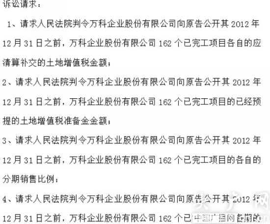 劉亞軍:讓他公開截止到2012年12月31日前,萬科的162個(gè)已經(jīng)完工的項(xiàng)目,各自應(yīng)清算的土地增值稅的金額,萬科他對(duì)這162個(gè)項(xiàng)目自己預(yù)提的土地增值稅準(zhǔn)備金金額,他準(zhǔn)備怎么交。