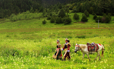 兩位林芝女子牽馬行走在林芝境內(nèi)的“魯朗花海”