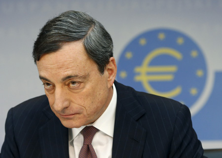 歐洲央行9日宣布維持基準利率在0.25%不變,與市場預期一致。英國央行當日也將基準利率維持在0.5%的歷史低點。 歐洲央行行長德拉吉在當日召開的發(fā)布會上重申歐洲央行此前承諾,將在很長一短時間內(nèi)維持利率在當前水平或更低水平。他還表示,歐洲央行已準備采取“果斷行動”,利用一切有效工具推動歐元區(qū)經(jīng)濟復蘇。 圖為德拉吉在于德國法蘭克福召開的歐洲央行貨幣政策會議后的發(fā)布會上發(fā)言。