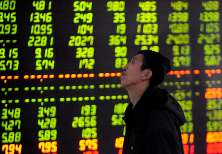 圖為當(dāng)日股民在沈陽(yáng)一家證券交易大廳關(guān)注股市行情。