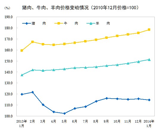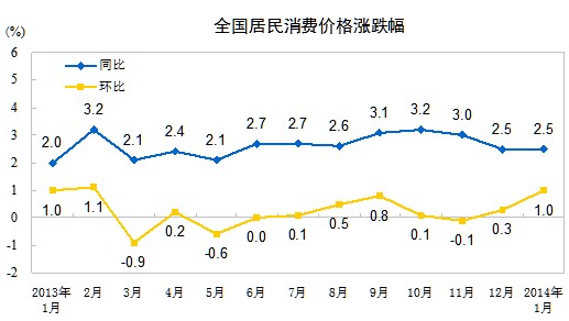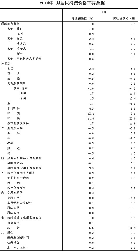 2014年1月份,全國居民消費(fèi)價(jià)格總水平同比上漲2.5%。其中,城市上漲2.6%,農(nóng)村上漲2.2%;食品價(jià)格上漲3.7%,非食品價(jià)格上漲1.9%;消費(fèi)品價(jià)格上漲2.0%,服務(wù)價(jià)格上漲3.7%。
