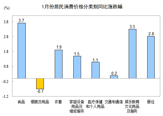 1月份,食品價(jià)格同比上漲3.7%,影響居民消費(fèi)價(jià)格總水平同比上漲約1.23個(gè)百分點(diǎn)。其中,鮮果價(jià)格上漲23.0%,影響居民消費(fèi)價(jià)格總水平上漲約0.44個(gè)百分點(diǎn);液體乳及乳制品價(jià)格上漲11.9%,影響居民消費(fèi)價(jià)格總水平上漲約0.17個(gè)百分點(diǎn);水產(chǎn)品價(jià)格上漲6.3%,影響居民消費(fèi)價(jià)格總水平上漲約0.16個(gè)百分點(diǎn);糧食價(jià)格上漲3.1%,影響居民消費(fèi)價(jià)格總水平上漲約0.09個(gè)百分點(diǎn);鮮菜價(jià)格上漲2.1%,影響居民消費(fèi)價(jià)格總水平上漲約0.07個(gè)百分點(diǎn);肉禽及其制品價(jià)格上漲0.3%,影響居民消費(fèi)價(jià)格總水平上漲約0.02個(gè)百分點(diǎn)(豬肉價(jià)格下降4.3%,影響居民消費(fèi)價(jià)格總水平下降約0.15個(gè)百分點(diǎn));蛋價(jià)格下降3.8%,影響居民消費(fèi)價(jià)格總水平下降約0.03個(gè)百分點(diǎn)。
