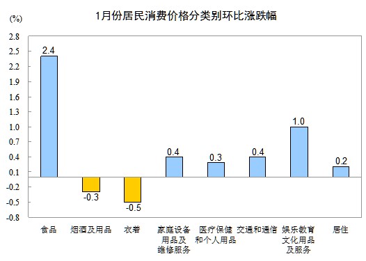 1月份,全國居民消費(fèi)價(jià)格總水平環(huán)比上漲1.0%。其中,城市上漲1.0%,農(nóng)村上漲0.9%;食品價(jià)格上漲2.4%,非食品價(jià)格上漲0.3%;消費(fèi)品價(jià)格上漲1.1%,服務(wù)價(jià)格上漲0.8%。