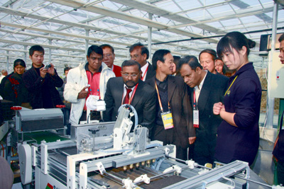 中外游客參觀現(xiàn)代農(nóng)業(yè)示范園區(qū)展示的先進(jìn)的播種設(shè)備