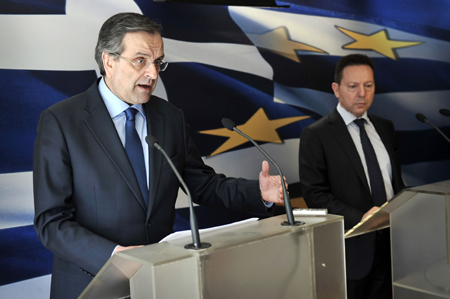 經(jīng)過長達(dá)7個月的談判,希臘與國際債權(quán)人18日就后者向希臘發(fā)放救助貸款的條件達(dá)成協(xié)議。希臘總理薩馬拉斯當(dāng)天在協(xié)議達(dá)成后對媒體說:“(希臘政府)與國際債權(quán)人的漫長談判成功結(jié)束!毕ED財(cái)政部長斯圖納拉斯則表示,這次談判是歷次發(fā)放貸款談判中最艱難的一次。 圖為薩馬拉斯(左)與斯圖納拉斯在雅典出席新聞發(fā)布會。