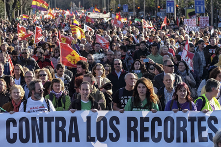 示威者22日在西班牙首都馬德里舉行大規(guī)模游行抗議活動,反對政府采取的財政緊縮措施。為解決沉重的公共債務(wù)問題,西班牙政府過去兩年一直在推行財政緊縮和增稅措施,旨在2012年至2014年間節(jié)省1500億歐元。但這使西班牙經(jīng)濟疲弱形勢加劇,失業(yè)率高達26%,引起民眾不滿。 圖為22日抗議者在馬德里游行,條幅上的字意為“反對財政緊縮”。