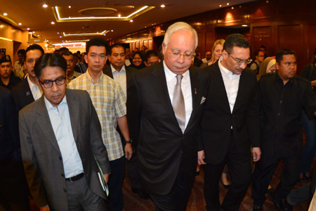 3月24日,馬來(lái)西亞總理納吉布宣布,新的數(shù)據(jù)顯示失聯(lián)的馬航MH370航班在澳大利亞城市珀斯西部的南印度洋海域墜毀。納吉布表示,根據(jù)新的分析結(jié)果,空難調(diào)查處和國(guó)際海事衛(wèi)星組織認(rèn)為MH370航班曾沿著南部走廊飛行,它的“最終位置”是在珀斯西部的印度洋。 圖為納吉布(中)離開(kāi)發(fā)布會(huì)現(xiàn)場(chǎng)。