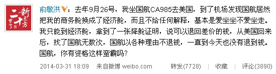 新東方董事長(zhǎng)俞敏洪今日在微博上投訴,國(guó)航把其商務(wù)艙換成了經(jīng)濟(jì)艙,而且不給任何解釋?zhuān)伊藝?guó)航無(wú)數(shù)次,國(guó)航以各種理由不退錢(qián)。以下為其微博全文: