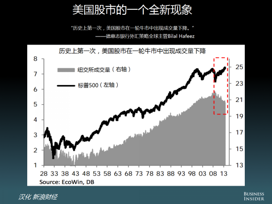 “歷史上第一次,美國股市在一輪牛市中出現(xiàn)成交量下降!薄乱庵俱y行外匯策略全球主管Bilal Hafeez
