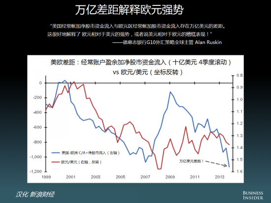 “美國經(jīng)常帳加凈股市資金流入與歐元區(qū)經(jīng)常帳加股市資金流入存在萬億美元的差距。這很好地解釋了歐元相對于美元的強勢,或者說美元相對于歐元的糟糕表現(xiàn)!”——德意志銀行G10外匯策略全球主管Alan
