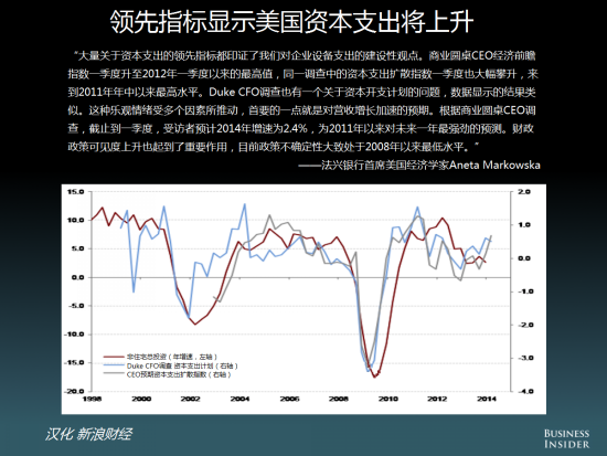 CFO調(diào)查也有一個關(guān)于資本開支計劃的問題,數(shù)據(jù)顯示的結(jié)果類似。這種樂觀情緒受多個因素所推動,首要的一點就是對營收增長加速的預(yù)期。根據(jù)商業(yè)圓桌CEO調(diào)查,截止到一季度,受訪者預(yù)計2014年增速為2.4%,為2011年以來對未來一年最強勁的預(yù)測。財政政策可見度上升也起到了重要作用,目前政策不確定性大致處于2008年以來最低水平!薄ㄅd銀行首席美國經(jīng)濟學(xué)家Aneta