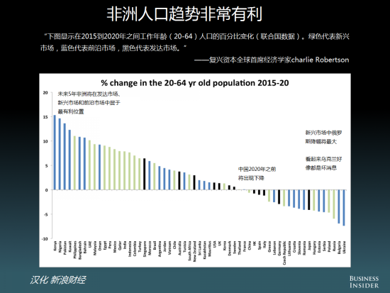 “下圖顯示在2015到2020年之間工作年齡(20-64)人口的百分比變化。綠色代表新興市場,藍(lán)色代表前沿市場,黑色代表發(fā)達(dá)市場!薄獜(fù)興資本全球首席經(jīng)濟學(xué)家charlie