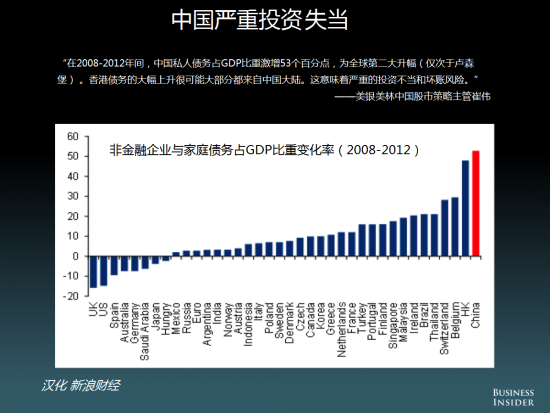 “在2008-2012年間,中國私人債務(wù)占GDP比重激增53個百分點,為全球第二大升幅(僅次于盧森堡)。香港債務(wù)的大幅上升很可能大部分都來自中國大陸。這意味著嚴(yán)重的投資不當(dāng)和壞賬風(fēng)險。”——美銀美林中國股市策略主管崔偉