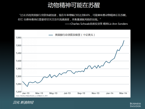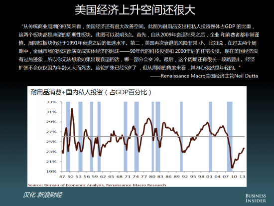 “從傳統(tǒng)商業(yè)周期的框架來看,美國經(jīng)濟還有很大改善空間。此圖為耐用品支出和私人投資整體占GDP的比重,這兩個板塊都是典型的周期性板塊。此圖可以說明3點。首先,自從2009年衰退結(jié)束之后,企業(yè)和消費者都非常謹(jǐn)慎。周期性板塊仍處于1991年衰退之后的低迷水平。第二,美國再次衰退的風(fēng)險非常小。比如說,在過去兩個周期中,金融市場的泡沫都演變成實體經(jīng)濟的泡沫——90年代的科技投資和2000年后的住宅投資,F(xiàn)在美國經(jīng)濟沒有過熱跡象,所以你無法想象如果出現(xiàn)衰退的話,哪一部分會變冷。最后,這個周期還有很長一段路要走。經(jīng)濟擴張不會僅僅因為年齡太大而死去。這輪擴張已經(jīng)5歲了,但從周期的角度來看,其內(nèi)心依然是年輕的!薄猂enaissance
