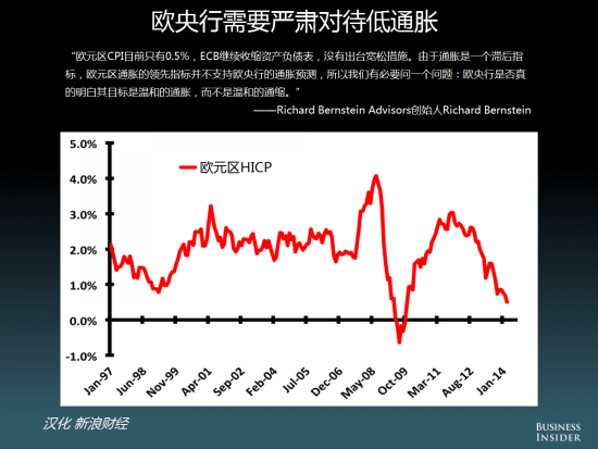 “歐元區(qū)CPI目前只有0.5%,ECB繼續(xù)收縮資產(chǎn)負(fù)債表,沒有出臺寬松措施。由于通脹是一個滯后指標(biāo),歐元區(qū)通脹的領(lǐng)先指標(biāo)并不支持歐央行的通脹預(yù)測,所以我們有必要問一個問題:歐央行是否真的明白其目標(biāo)是溫和的通脹,而不是溫和的通縮。”——Richard