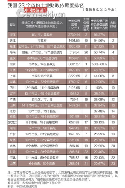 根據(jù)上述的省級政府審計部門的公開審計報告及其相關數(shù)據(jù),《中國經(jīng)濟周刊》、中國經(jīng)濟研究院聯(lián)合研究并發(fā)布“我國23個省份‘土地財政依賴度’排名報告”(下稱《報告》)。