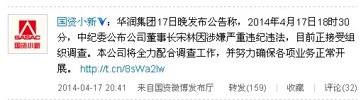 華潤(rùn)集團(tuán)17日晚發(fā)布公告稱,2014年4月17日18時(shí)30分,中紀(jì)委公布公司董事長(zhǎng)宋林因涉嫌嚴(yán)重違紀(jì)違法,目前正接受組織調(diào)查。本公司將全力配合調(diào)查工作,并努力確保各項(xiàng)業(yè)務(wù)正常開(kāi)展。