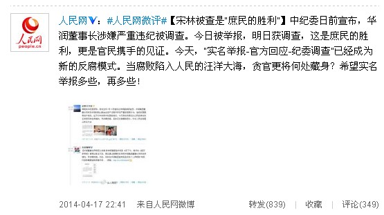 #人民網(wǎng)微評(píng)#【宋林被查是“庶民的勝利”】中紀(jì)委日前宣布,華潤(rùn)董事長(zhǎng)涉嫌嚴(yán)重違紀(jì)被調(diào)查。今日被舉報(bào),明日獲調(diào)查,這是庶民的勝利,更是官民攜手的見證。今天,“實(shí)名舉報(bào)-官方回應(yīng)-紀(jì)委調(diào)查”已經(jīng)成為新的反腐模式。當(dāng)腐敗陷入人民的汪洋大海,貪官更將何處藏身?希望實(shí)名舉報(bào)多些,再多些!
