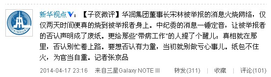 【子夜微評】華潤集團董事長宋林被舉報的消息火燒網(wǎng)絡,僅僅兩天時間便真的燒到被舉報者身上。中紀委的消息一錘定音,讓被舉報者的否認聲明成了廢紙。更給那些“帶病工作”的人提了個醒兒:真相就在那里,否認別忙著上路。要想否認有力量,當初就別做虧心事兒。紙包不住火,為官當自重。