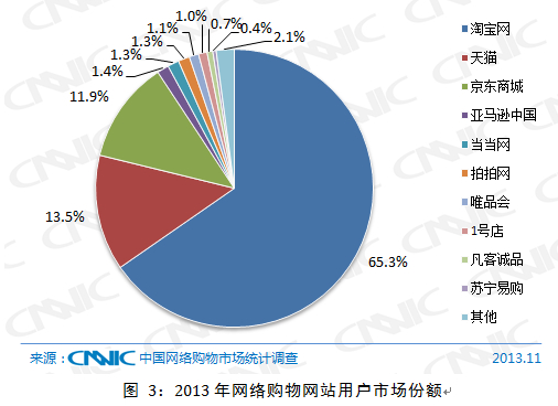 淘寶網(wǎng)、天貓、京東商城的用戶份額在網(wǎng)購(gòu)市場(chǎng)排名前三,占據(jù)90.7%的用戶市場(chǎng)。其中,淘寶網(wǎng)占據(jù)65.3%的用戶市場(chǎng)份額,天貓占據(jù)13.5%的用戶市