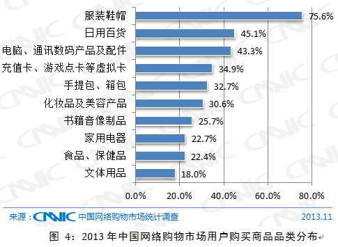 2014年4月,中國(guó)互聯(lián)網(wǎng)絡(luò)信息中心CNNIC發(fā)布了《2013年中國(guó)網(wǎng)絡(luò)購(gòu)物市場(chǎng)研究報(bào)告》。報(bào)告顯示,2013年網(wǎng)絡(luò)購(gòu)物市場(chǎng)穩(wěn)步快速向前發(fā)展,彰
